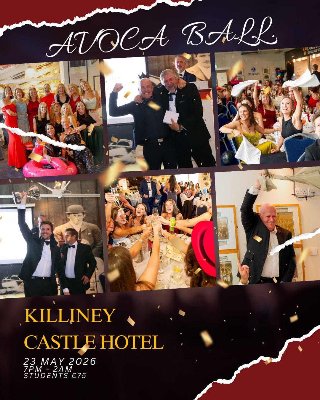 Saturday 23rd May 2026 7pm - 2am Killiney Castle Hotel Black tie Adult ticket cost €90 Student ticket cost €75
